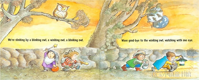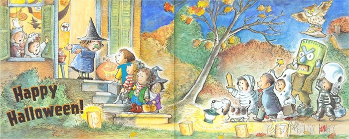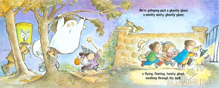 故事讲述了一群勇敢的孩子在万圣节这天晚上,一起去镇上的“女巫”家里讨糖果,在路上他们遇见了大恶狼,幽灵,吸血鬼,骷髅,僵尸 … 大家克服心里的恐惧,一起奔跑,最后来到女巫家里,被恶作剧了一番后,大家一起度过了一个快乐有趣的万圣节。诙谐的语言很有节奏感,让孩子们看了也会忍不住想不断地大喊“ Trick or Treat ” ~~