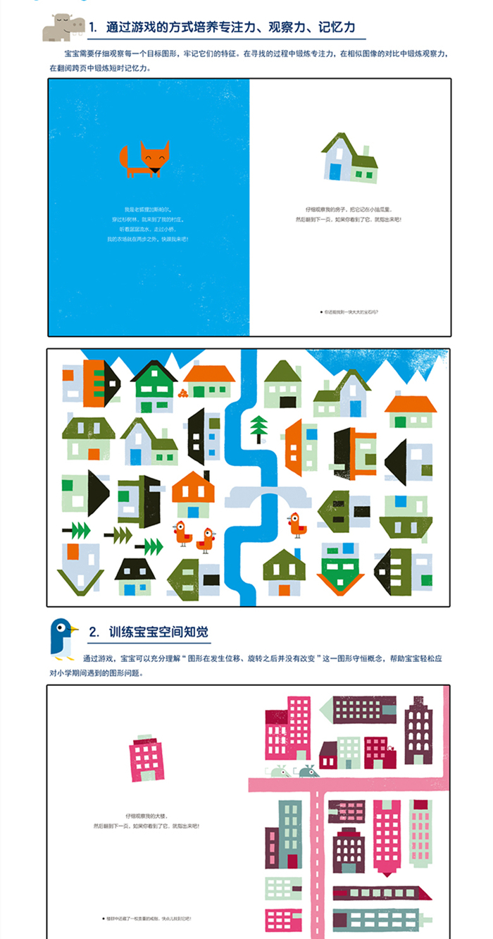 1.通过游戏的方式,培养宝宝的专注力、观察力、记忆力。宝宝需要仔细观察每一个目标图形,牢记他们的特征。在寻找的过程中锻炼专注力,在相似图像的对比中锻炼观察力,在翻阅跨页中锻炼短时记忆力。