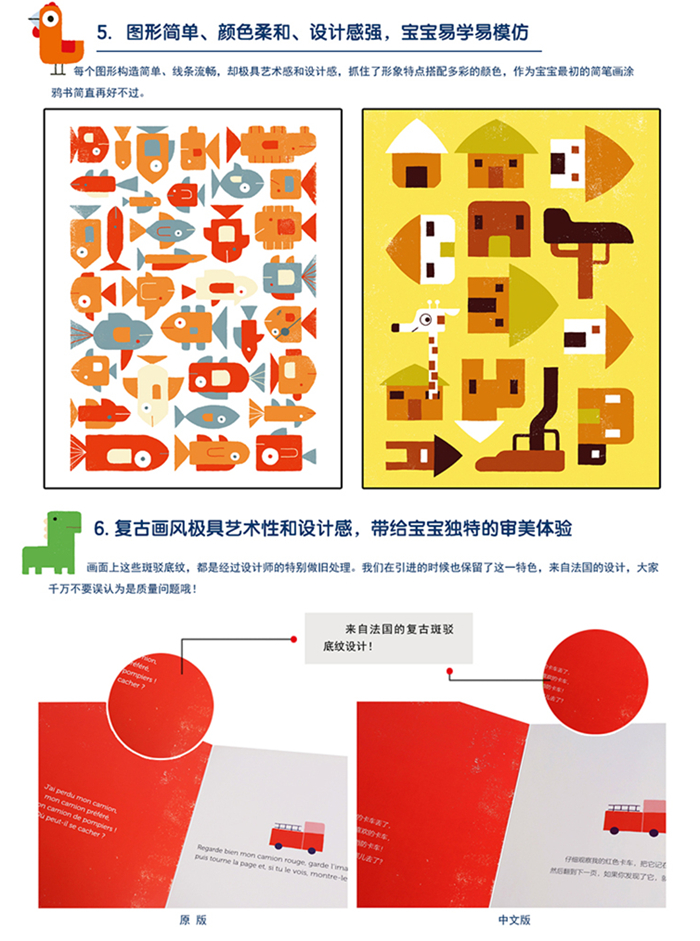 3.充分锻炼宝宝的归纳、类比等逻辑思维能力。跨页中的30几个图形的形状、颜色都很相似,宝宝需要充分理解并记住目标图形:颜色的深浅、细节的位置、形状的搭配等,都需要宝宝进行类比和归纳。