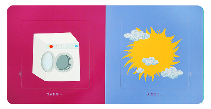从翻页的设计看,六册书可以分为两种类型:《动物》《对对碰》《里面有》是单纯的翻翻看设计;《形状》《颜色》《数字》是翻翻看+挖洞洞设计。
