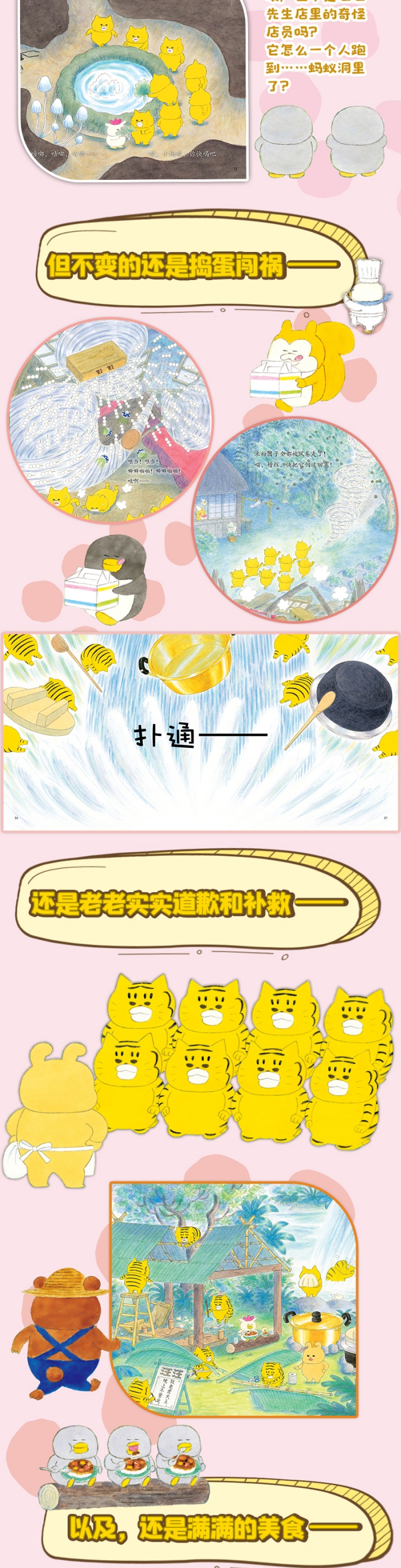 这是汪汪先生的蛋糕店,野猫军团正偷偷地往里面看。刚烤好的蛋糕真香、真好吃,野猫军团也好想吃。他们刚想靠近一点,没想着踩到了会魔法的蚂蚁,被蚂蚁变得好小好小!