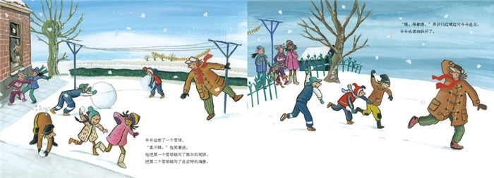 “天气很冷。”爷爷说,说完便向外面跑去。“别忘了你们的手套和帽子,还有穿上靴子。”“快点!”丽萨喊道。她做了一个雪球,并将雪球扔向了空中。