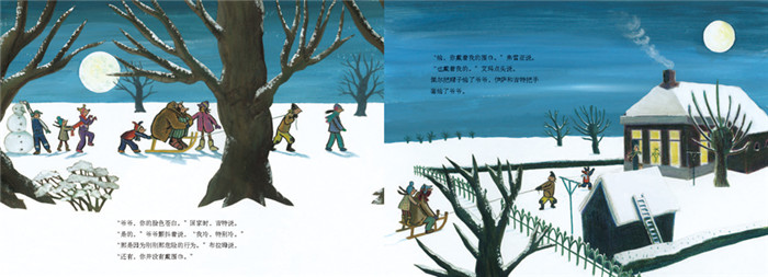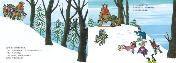 爷爷拉着雪橇走过花园小路,突然,爷爷拉紧绳子,孩子们全都摔倒了。穿过田野,“不,爷爷,你用力太猛了。”孩子们笑着说。然后,让孩子们一个挨一个地坐到雪橇上。“嘿,”吉特突然说,“我丢了一只手套。”