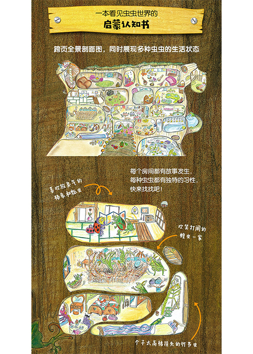 1.“虫虫旅馆”系列共三本:《欢迎光临虫虫旅馆》《虫虫旅馆的怪物风波》《虫虫旅馆的地下室之谜》。这是一套让孩子看见虫虫世界的启蒙认知书,一套令人欲罢不能的视觉发现游戏书,一套有故事有生活有爱的图画书。从天而降的大粪球、黏糊糊的大眼怪,神秘的地下室,看虫虫们如何用自己的智慧和勇气,团结一致共渡难关。 2.图书通过跨页旅馆全景剖面图展现数十种虫虫的形态变化、生活习性和生存技能,虫虫旅馆的每一个房间里都有故事发生,每一个房间里虫虫除了各自的小故事还会参与贯穿全文的大故事,小细节中有大发现,让孩子在阅读趣味故事的过程中,了解各种昆虫的生活,潜移默化中培养孩子对自然科学的兴趣。