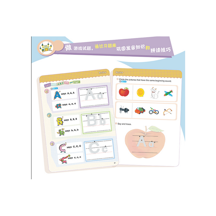 《美式幼儿园自然拼读分级教材•Level 1》共10册书,围绕26个英文字母,通过美式原音领读的方式,教会小朋友学会26个字母的字母音、字母名,以及相关常用单词的自然拼读发音技巧。通过韵律儿歌和趣味故事,辅以游戏试题巩固所学,教孩子辨识字母及字母组合之间的拼读规则,帮孩子建立起字母及字母组合与发音之间的直觉音感,让孩子看到单词就会读,听到发音就会写。