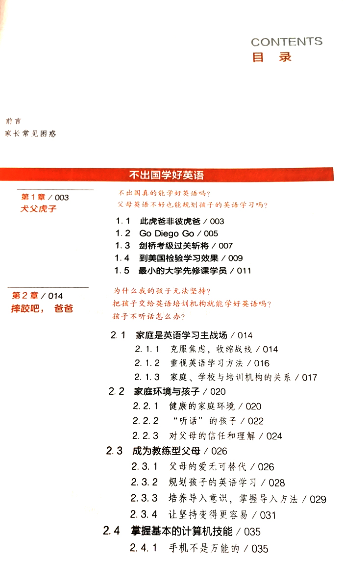 本书作者是个非常普通的孩子爸爸,但他从孩子5岁开始,利用丰富的互联网英语资源,借助先进的英语学习软件,按照科学的训练方法,加上日复一日的坚持,在12 岁语言关键期内,将孩子的英语能力提升到接近母语水平。正文首先简要介绍Diego的成长经历,然后帮助家长在思想上做好准备,完成教练员的角色定位;接下来分别从听说能力培养、词汇和阅读、拼写、语法和写作行文,最后的以考促学部分对各阶段孩子适合的英语考试做了详细阐述,将Diego在每个阶段的案例和具体做法恰当地融入其中。Diego爸爸走出了一条哑巴英语爸爸当教练员带领孩子学英语的成功道路,本书内容非常接地气,有很强的可复制性和实操性。