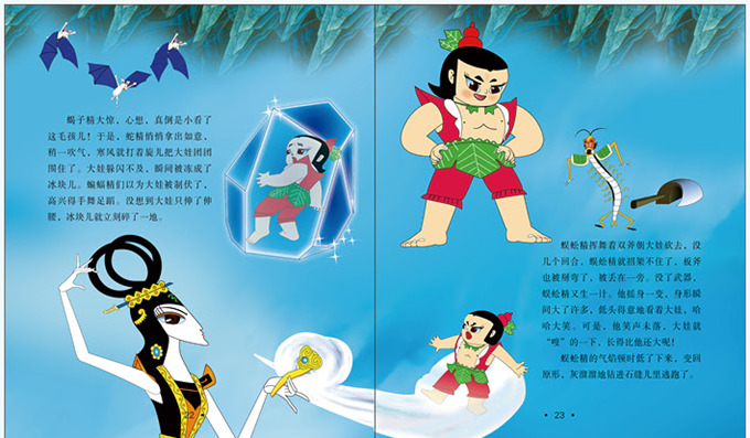 传说,葫芦山下关着蛇精和蝎子精两个妖怪,只要再过一年,就会化成灰烬。可是,*不小心放走了妖怪,妖怪为祸人间,百姓遭难。善良的老爷爷在采药途中,从*口里得知只要找到宝葫芦籽儿,种出神葫芦就能消灭妖怪。宝葫芦籽落地了,它生根发芽,很快就长出了七色小葫芦,随后,七色葫芦又变成了各具本领的葫芦娃。大娃天生力大无穷;二娃有千里眼和顺风耳;三娃钢筋铁骨,刀枪不入;四娃善吐水;五娃善吐烈火和霹雳;六娃会隐身;七娃有法宝神葫芦。起初,葫芦娃单独出击,皆遭受到妖精的暗算,最后在彩莲的帮助下,葫芦兄弟连成一心,消灭了妖精。而善良的老爷爷和勇敢的*却被妖怪迫害了。