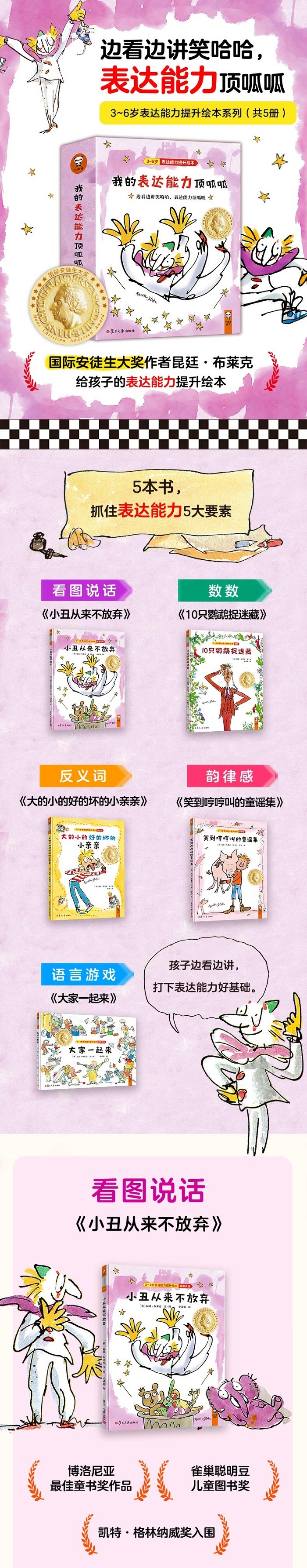 5本经典绘本,包含看图说话、数数、反义词、韵律感、语言游戏5种好玩的表达体验,让孩子表达能力大爆发!