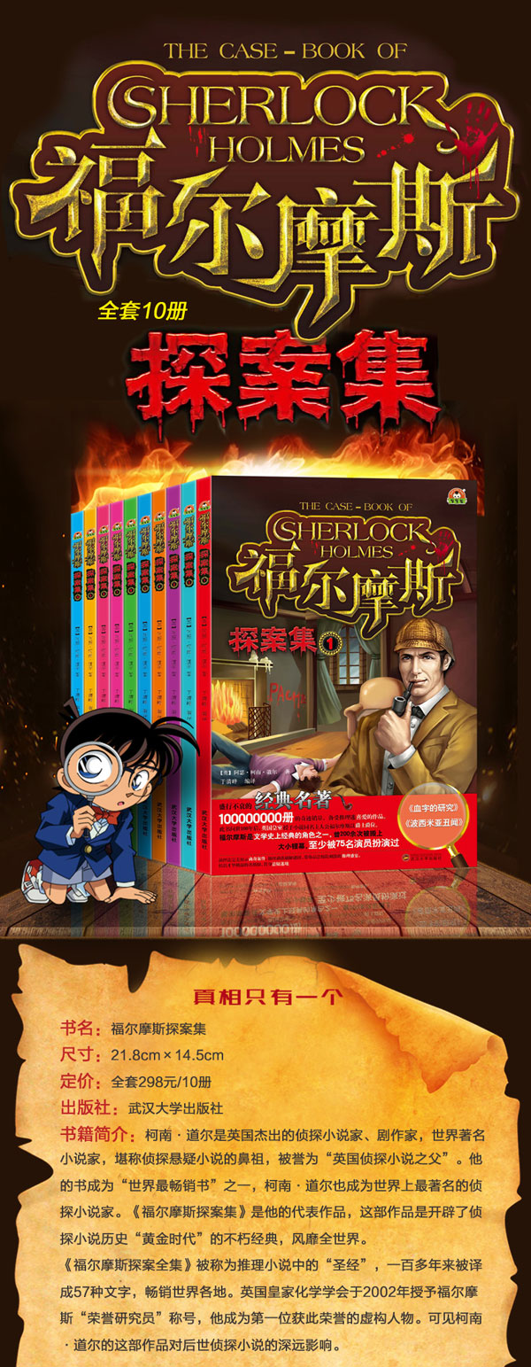 阿瑟·柯南·道尔,是英国杰出的侦探小说家、剧作家,世界著名小说家,堪称侦探悬疑小说的鼻祖,被誉为“英国侦探小说之父”。他的书成为“世界畅销书”之 一,柯南·道尔也成为世界上著名的侦探小说家。《福尔摩斯探案集》是他的代表作品,这部作品开辟了侦探小说历史“黄金时代”的不朽经典,风靡全世界。
