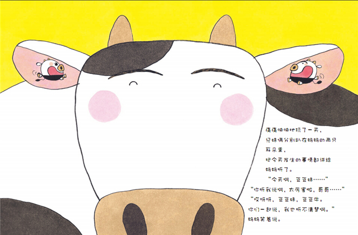 豆豆牛可不想当哥哥,那样妈妈的奶头就不只属于他了。不过,当豆豆妹突然降临的时候,他觉得豆豆妹还是很可爱的。他们一起晒太阳、骑着蜥蜴上山坡,一起给猪搔痒痒。他们玩了一整天,豆豆妹走不动了,豆豆牛只好把豆豆妹背回了家。这天晚上,豆豆牛一直在跟妈妈撒娇。是呀,别忘了,虽然是哥哥了,豆豆牛也是个孩子呢。