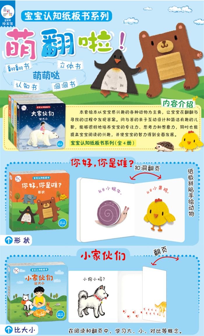 《宝宝认知纸板书:比大小:大家伙们》:豹子、狮子、北极熊、大象、鲸鱼……本书选取了几种常见的“大动物”帮助宝宝理解大小的概念。画面幽默有趣,并配以精心设计的翻页形式,并向宝宝提出了“…大吗?”的问题,引导宝宝去猜想、去解答,让宝宝在认识几种“大动物”的同时,学会对比,理解大小的概念。