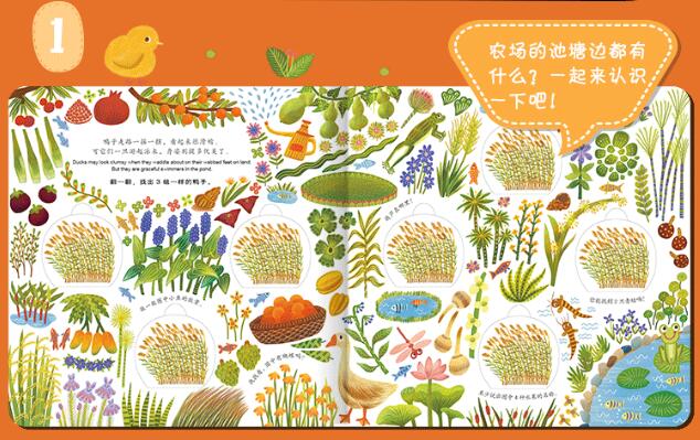 本书以农场为背景,用拟人化的方式给孩子介绍了农场中生活的一些小动物,鸡、鸭、青蛙、兔子等,孩子能轻轻松松理解这些动物的主要特点。全书绘画风格独特,采用零碎的动植物、事物展现了每页中的“主角”主要活动的环境,画风清新、色彩亮丽;另外,翻翻以及视觉记忆游戏的巧妙结合,有趣的找寻游戏,更是对孩子眼力的大考验,能锻炼孩子的记忆力,培养专注力、观察力;巧妙加入的数量变化还能对孩子进行数学启蒙。
