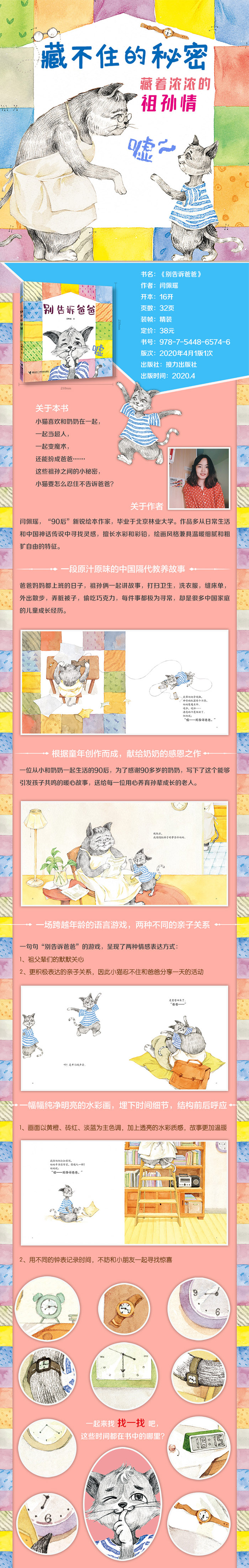 在父母都上班的时候,“我”和奶奶有很多相处时间,自然发生了很多他们不知道的故事。一件件不能告诉爸爸的秘密,成了小猫和奶奶不想被发现的小小约定。奶奶做的很多事情是怕爸爸担心,于是跟宝宝说“嘘,别告诉爸爸”,宝宝觉得好玩儿,也在调皮的时候跟奶奶说“嘘,别告诉爸爸”,这些都成为宝宝和奶奶之间的小秘密。可是,在小孩子的世界中,保守秘密不是那么容易的事情,就算是自己玩闹的举动也想跟父母分享。爸爸下班回来之后,宝宝忍了又忍,结果还是忍不住都告诉了爸爸。