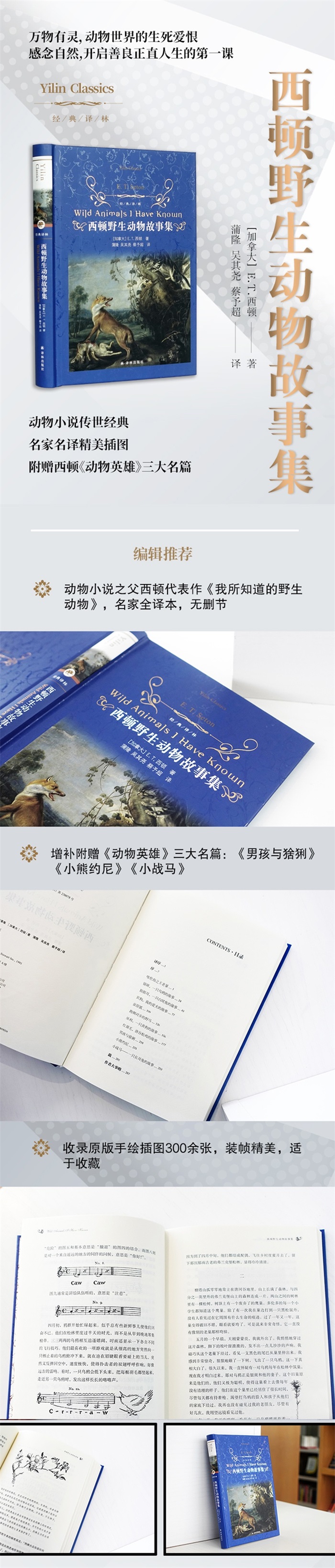 ? 动物小说之父西顿代表作《我所知道的野生动物》,名家全译本,无删节 ? 增补附赠《动物英雄》三大名篇《男孩与猞猁》《小熊约尼》《小战马》 ? 收录原版手绘插图,装帧精美,适于收藏