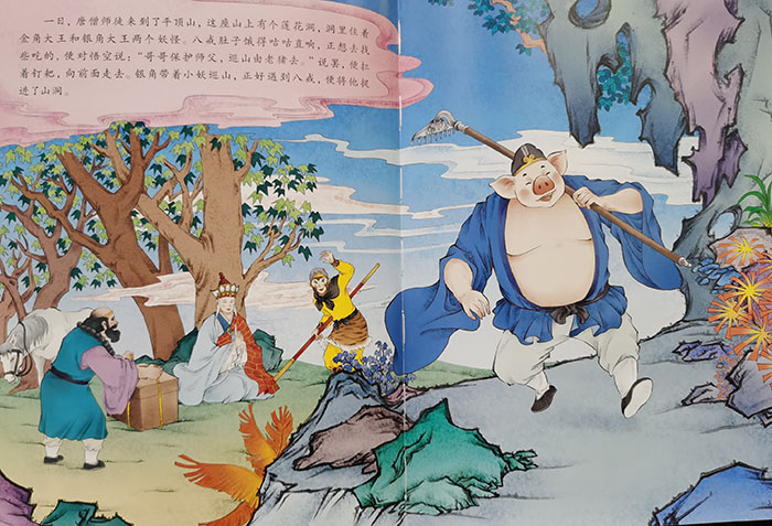一日, 唐僧师徒来到顶山, 这座山上有个莲花洞, 洞里住着金角大王和银角大王两个。八戒肚子饿得咕咕直响, 正想去找些吃的, 便对悟空说: “哥哥保护师父, 巡山有老猪去。”……