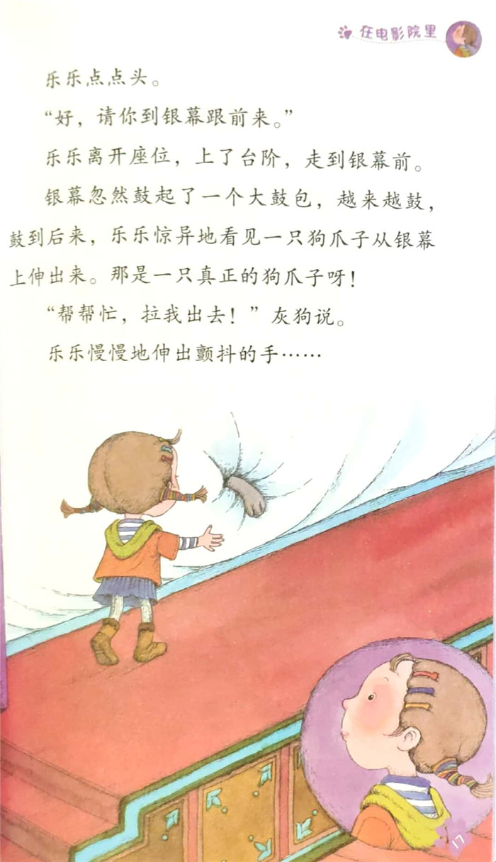 银幕上的那只正在奔跑的狗忽然停下来,看着小女孩说:你怎么又来看电影!小女孩惊呆了!她哆哆嗦嗦地走到银幕前,万万没有想到,一只真的狗爪子居然从银幕里伸出来。