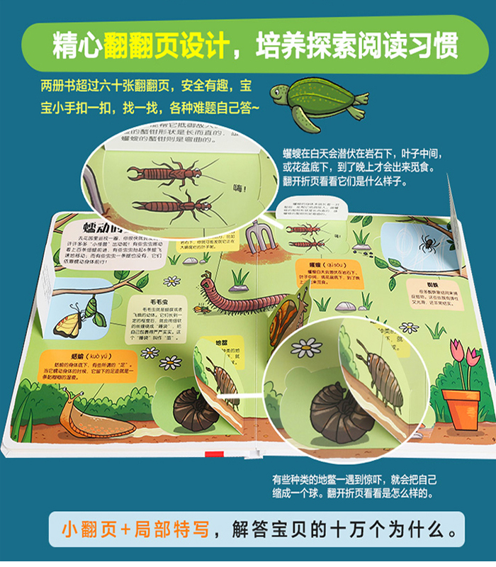 虫虫、海洋两大经典畅销主题,带领孩子深入海洋深处、探索虫虫世界;简单可爱的画风,极具冲击力的色彩,迅速抓住孩子们的眼球;两册超过60张翻翻页,培养孩子的探究式思维;原版工艺,品质保证;环保印刷,给孩子安全的爱。