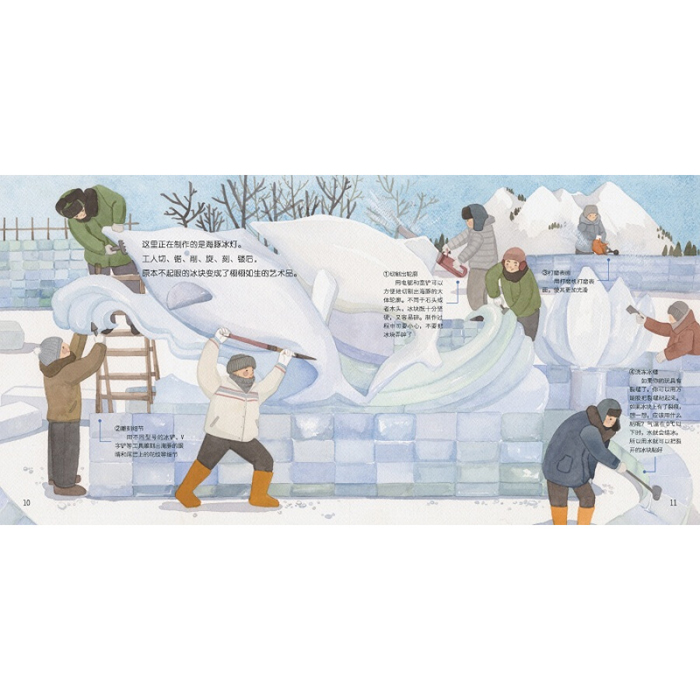 这本绘本以冰雪乐园即将举行,冰灯匠人忙碌的在江面上采冰为开头,介绍了冰灯、雪雕的制作过程,并展示了冰灯景色的魅力以及有趣的冰上游戏。用绘本的形式引起孩子对冰灯的兴趣,向孩子展现一个充满魅力的冰雪乐园!