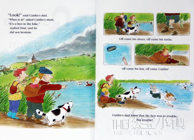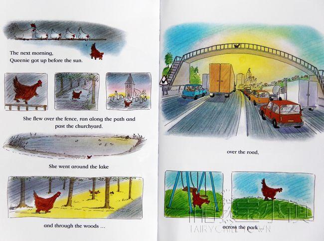 When Caitlin's dad rescues Queenie the bantam from a lake, it's the start of a quite egg-straordinary story. Queenie forms a strong attachment to the family. When they take her back to the farm where she came from, Queenie finds her way back to their home where she gets in the dog's basket and lays an egg! One day Catlin forgets to collect the eggs and Bruno the dog reclaims his basket. After that Queenie never returns, but Bruno hatches the eggs himself!