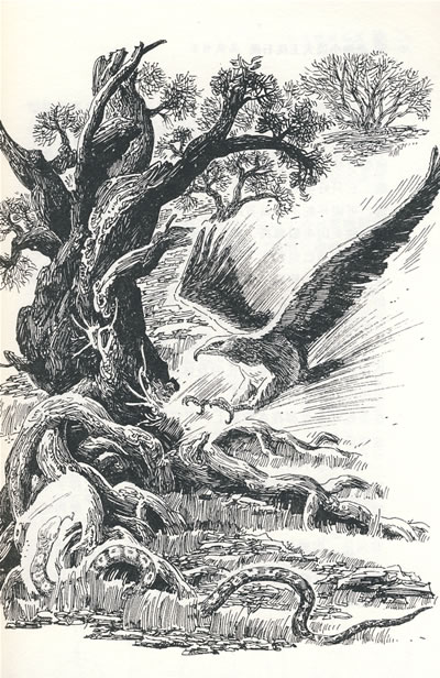果然,在它揪住蛇身的一瞬间,蛇头就反蹿上来,吞吐鲜红的蛇信子,欲往它腿上咬。它用力捏紧鹰爪,尖利的爪子抓破了蛇皮掐碎了蛇肉,但它攫抓的位置非蛇的要害部位,弯钩似的毒牙仍悍然朝它咬来。它是只有经验的雄鹰,它明白,倘若不立即松开鹰爪,蜜蜜香的悲剧将很快在它身上重演。它无奈地松开了爪子。它仅仅飞离地面五六公尺高,银环蛇就掉在地上,倏地钻进岩缝不见了。