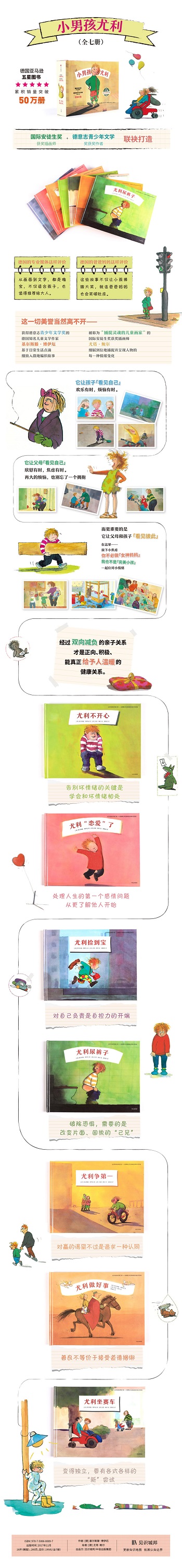 《小男孩尤利》是一套由国际安徒生奖获奖插画师和德国青少年文学奖获奖作者联袂打造的儿童桥梁绘本,通过小男孩尤利的日常生活,触摸孩子纯真而又敏感的内心世界,帮助孩子告别恐惧、不开心等坏情绪,让孩子变得独立又善良。