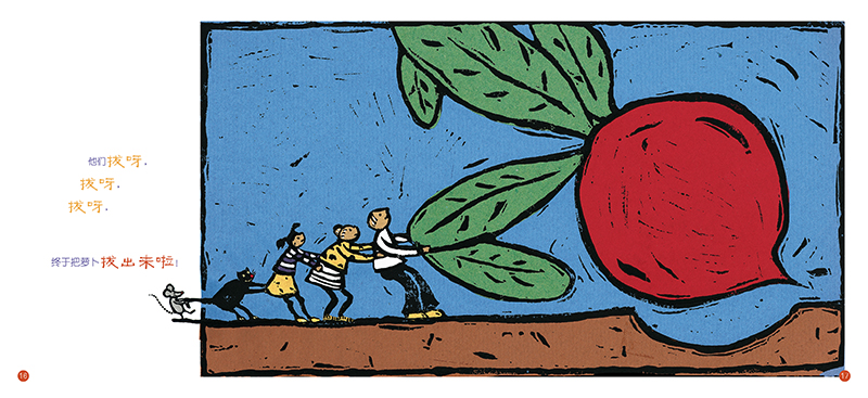 爷爷奶奶在花园里种了一棵萝卜,萝卜成熟了,爷爷却怎么也拔不掉,于是找来了奶奶帮忙,奶奶又找来了小孙女,小孙女又找来了小猫咪,小猫咪又找来了小老鼠……人多力量大,在所有人的齐心协力下,萝卜终于被拔了出来!