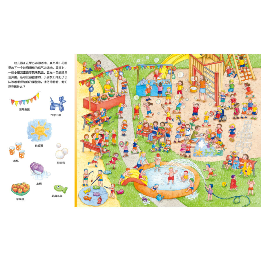 本书选择孩子熟悉的生活环境和经历作为基本内容,包含动物、交通工具、幼儿园、孩子的日常生活、城市、节日等六大方面,近百个生活场景,1000多个寻找的目标。图画色彩明快,贴近生活中的真人真物,内容丰富。版面将左右不均匀地分割成两个观察区,左边是单物,右边是全景大图,这样的设计能自然地激起了孩子观察右图,寻找左边物品的愿望。在进行视觉发现游戏时,还可以变换多种游戏方式和孩子一起玩。