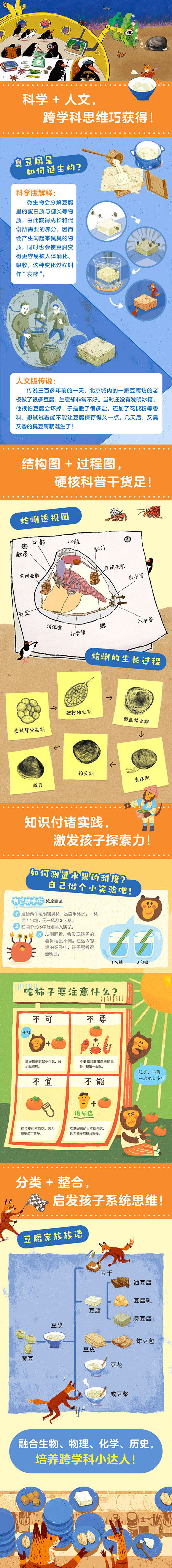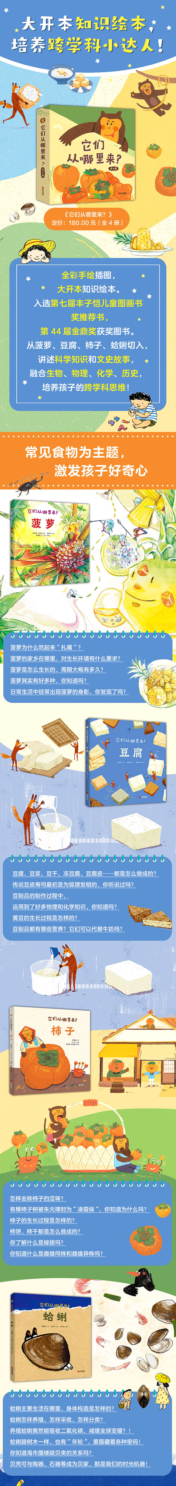 本套书共四册,分别讲述了柿子、豆腐、蛤蜊、菠萝四种常见食物的由来及与它们有关的科学知识和文化历史。从孩子的好奇心与身边的事物出发,以图像展示,化繁为简,彰显趣味,整合科学与人文知识,跨领域、无界限!