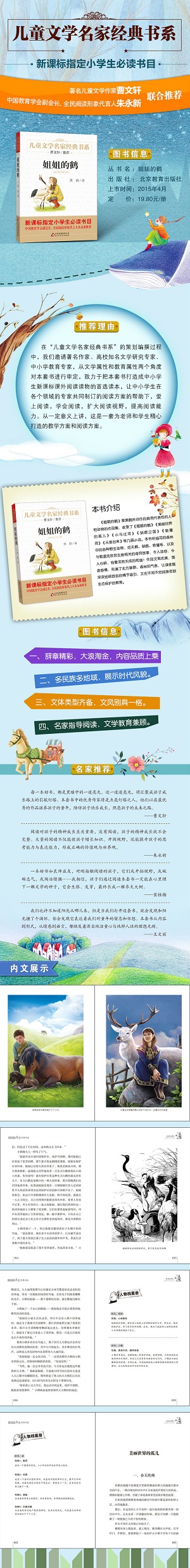 《姐姐的鹤》是黑鹤所创作的具有代表性的人和动物的作品集,收录了《姐姐的鹤》《美丽世界的孤儿》《小马过河》《驯鹿之国》《狼獾河》《从狼谷来》等几篇小说。本书所描写的森林中的各种野生动物,如天鹅、驯鹿、狼獾等,以及与鄂温克牧民生息相关的奇异故事,令人动容,令人心碎,有着浑然天成的和谐!作品文笔优美,饱含感情,充满了北方草原、森林的气息,让读者既深深地被跌宕的情节吸引,又在不知不觉间接受到生态保护的教育。