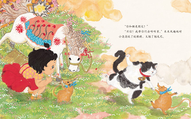 《大猫和小鼠》是《中国娃娃》系列图画书中的一册,讲述的是,小木马带着浇浇又出游了,小麻雀领着他们去认识自己的朋友老鼠米米。米米热情地招待他们,并告诉他们,他有一个朋友叫咪咪,是一只大猫,浇浇他们都不相信,老鼠和猫怎么能成为朋友呢,于是老鼠米米带着他们去大猫所在店,没想到看到店老板正凶狠地打骂大猫。他们见义勇为,打败店老板,救出了大猫,重获自由的大猫跟着浇浇他们乘着小木马一起飞上天空,飞到了翡翠城。整本书画面精美、形象生动、语言流畅,充满了丰富的想象力和纯真的童趣,同时又传递给孩子做人要仗义、勇敢,这样才能收获更多的朋友,人与万物都是朋友的信息。融趣味性、可读性和教育性于一体,是一本非常适合幼儿园阶段孩子阅读的优秀国内原创绘本。