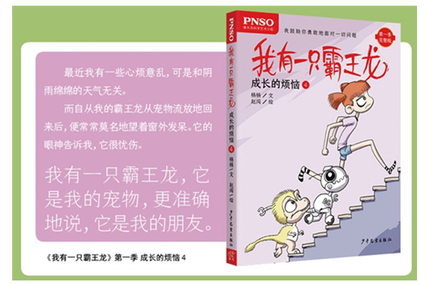 《我有一只霸王龙》第一季第一版获2015年中国童书榜年度优秀童书奖。这本心灵成长绘本小说系列的创作始于2011年,是一部关于红头发女孩和霸王龙的童话。书中虚构的独立世界被命名为”乐土城”,作者让这个虚构的城市承载了人类需要面对的众多问题,而解决问题的是书中的主人公一个11岁的红头发小女生”关关”和她的霸王龙。在这对小伙伴离奇古怪的日常生活中,困惑人类的众多问题变得轻松有趣,不再沉重,也让我们认识到,每个人都有着自己的喜欢与害怕,有着感情上的需要和被需要,以及自己快乐悲伤共存的曲曲折折的成长故事。这本书讲述了红头发小女孩关关和她的霸王龙从”宠物流放地”回来之后,为了安慰霸王龙,关关和她的小伙伴做了一只机器恐龙,所以一切都会更好么?