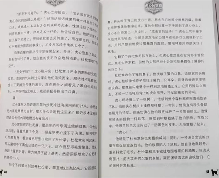 《虎心的阴影》讲述的故事发生在正传《猫武士六部曲(暗影幻象)》这一时期。本书以五大猫族影族副族长虎心与雷族武士母猫鸽翅的恋情纠葛为线索,讲述了他们因梦为爱出走城市,历尽艰险养育儿女,终又排除万难回归影族的曲折故事。 该作想象丰富,奇幻异彩,通过雷族武士母猫鸽翅因梦独自离开雷族到城市生儿育女,影族副族长虎心由梦脱离影族追寻鸽翅,城市猫塔尖以梦指引虎心与鸽翅带领众猫回归影族等奇幻构思,勾画了《虎心的阴影》复杂多变的故事情节。 该作情节曲折,悬念迭出,层层推进,逐渐揭晓谜底。各章节结尾,如同中国传统章回小说与现当代电视剧写法,留下扣子,吸引读者继续阅读,具有较强的可读性。 该作塑造了影族、雷族多个猫武士和城市猫形象,性格鲜明迥异,栩栩如生。其中影族副族长虎心责任感强、富于理性,雷族武士母猫鸽翅意志坚定、敢作敢为,影族族长花楸星能力有限而又多疑,城市猫塔尖富有爱心与预见,城市猫暴烈果敢而有主见,等等。