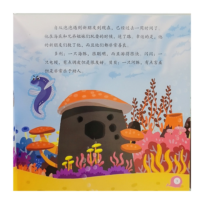 《泡泡龟海底历险记》是一套系列图书,以12个生动有趣的小故事,为孩子们呈现出一只小乌龟独自成长的经历。小鸟龟泡泡在海底游玩时,遇到了一阵旋涡后,与家人失散了。在迷途中,小鸟龟遇到了善良可爱的朋友们:多利(海豚)、贝贝(河豚)、卡卡(螃蟹)、可可(海星)、闪闪(电鰻)、卡米(章鱼),他们互相帮助,一起玩耍,一起愉快地生活。在丰富多彩的海洋世界里,孩子们可以跟随着泡泡龟的历险过程学会成长,用爱与尊重去包容和理解他人,培养良好的道德观和优秀价值观。