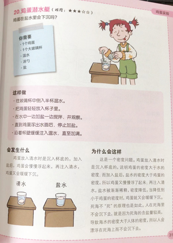 《101个神奇的实验》从日常生活现象入手,通过丰富有趣的实验现象、浅显易懂的解释、生动形象的插图,带领小朋友们自己动手,从简易好玩的科学实验入手,循序渐进,在神奇有趣的实验中,了解它们的特性,例如:为什么刚煮熟的鸡蛋用冷水泡过就很容易剥开了?怎样用吸管让水分出层次呢?为什么植物幼苗总向上生长?各种各样形状的巧克力是怎么制作的?折成什么形状的纸最能承重呢?为什么用毛巾包裹的冰块融化会变慢?为什么太阳暴晒下,深色气球很容易就炸了,而浅气球则不会?……孩子在实验中体验科学的神奇力量,培养丰富的想象力;通过操作示范,帮助孩子理解和运用各种科学原理,提升学习力;父母也可以与孩子互动起来,教会孩子独立思考,发掘出他们潜藏的创造力,营造出快乐的学习环境!此外,本套实验书按版块展开,并标注实验难易星级,由浅入深地开展,讲解知识。最值得一提的是,本书遵循简单有趣的实验...