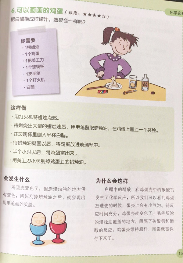 《101个神奇的实验》从日常生活现象入手,通过丰富有趣的实验现象、浅显易懂的解释、生动形象的插图,带领小朋友们自己动手,从简易好玩的科学实验入手,循序渐进,在神奇有趣的实验中,了解它们的特性,例如:为什么刚煮熟的鸡蛋用冷水泡过就很容易剥开了?怎样用吸管让水分出层次呢?为什么植物幼苗总向上生长?各种各样形状的巧克力是怎么制作的?折成什么形状的纸最能承重呢?为什么用毛巾包裹的冰块融化会变慢?为什么太阳暴晒下,深色气球很容易就炸了,而浅气球则不会?……孩子在实验中体验科学的神奇力量,培养丰富的想象力;通过操作示范,帮助孩子理解和运用各种科学原理,提升学习力;父母也可以与孩子互动起来,教会孩子独立思考,发掘出他们潜藏的创造力,营造出快乐的学习环境!此外,本套实验书按版块展开,并标注实验难易星级,由浅入深地开展,讲解知识。最值得一提的是,本书遵循简单有趣的实验...
