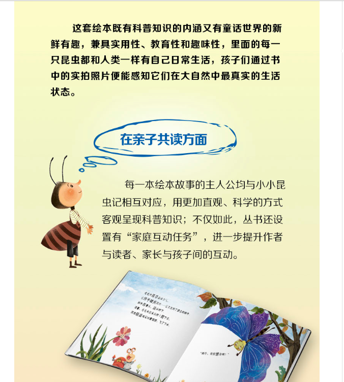 l、每一本绘本故事的主人公均与小小昆虫记相互对应,用更加直观、科学的方式客观呈现科普知识。
