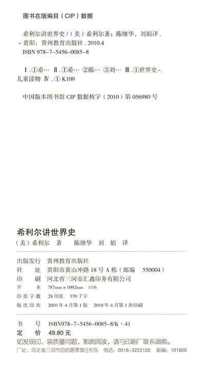 大约五十年前,美国有位儿童教育家希利尔,积多年当小学校长的教学经验,以五年时间,写成一本《希利尔讲世界史》,用极其生动形象的语言和有趣的故事情节,向儿童们讲述了从万物的起源到**次世界大战的许多世界大事和著名人物。出版以后,轰动欧美教育界,不断再版,成为英美等国著名的儿童读物。此书我国曾经有陈汉年的译本,一九三六年由上海大东书局出版。因印数很少(初版只一千册),读过的人恐怕不多。不过我想,当时看过这本书的中国小读者,定会为得到一本有趣的读物而欢喜,同时,又会因为那终究是外国人写给外国孩子看的而感到不完全满足。他们也许曾经热烈地期待过:中国也会有一位希利尔,为中国孩子写一本这样的书。将近半个世纪的时间过去了,当年的少年儿童,已经鬓发斑白,而我们中国自己的儿童世界史话始终没有出现。