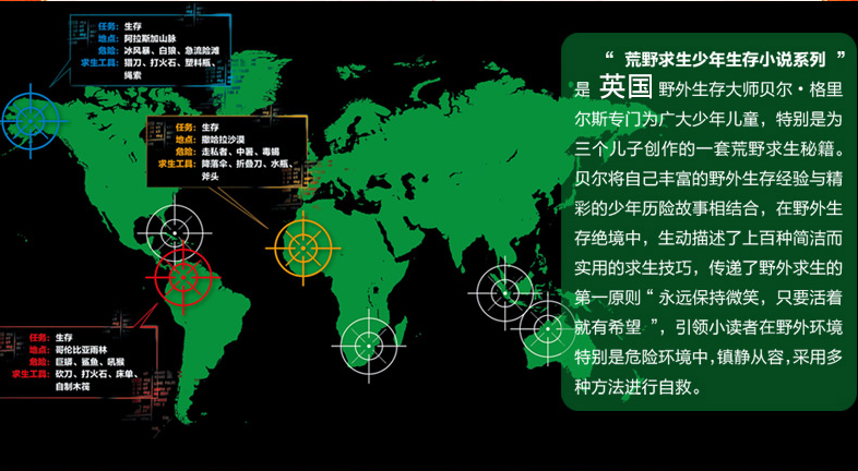 这套“用故事讲述亲历的荒野冒险,以父爱传递真正的求生技巧”的经典作品,将以不同于一般儿童文学作品的刚健、明朗、自然、实用,带给小读者们来自生命和人类本真的力量,传授给小读者真正的求生技巧,读一本书,多一条命。——网易掌握丰富的生存技能,是险境求生的重要条件。在“荒野求生少年生存小说系列”中,作者贝尔·格里尔斯将他多年来求生经验和技巧进行了总结,通过书中的主人公贝克,教会读者如何在各种危险的情境下进行自救,成功逃生。——广州日报除了这些实用的求生技巧外,贝尔·格里尔斯还向孩子们传达了自己的生存哲学,那就是无论处在多么危险的环境,都要保持乐观的态度,永不放弃。生命宝贵,生命本身就值得尊重和敬畏。在这套“荒野求生少年生存小说”中,贝尔·格里尔斯也表达了这一点。——未来网 这套“用故事讲述亲历的荒野冒险,以父爱传递真正的求生技巧”的经典作品,将以不同于一般儿童文学作品的刚健、明朗、自然、实用,带给小读者们来自生命和人类本真的力量,传授给小读者真正的求生技巧,读一本书,多一条命。——网易掌握丰富的生存技能,是险境求生的重要条件。在“荒野求生少年生存小说系列”中,作者贝尔·格里尔斯将他多年来求生经验和技巧进行了总结,通过书中的主人公贝克,教会读者如何在各种危险的情境下进行自救,成功逃生。——广州日报除了这些实用的求生技巧外,贝尔·格里尔斯还向孩子们传达了自己的生存哲学,那就是无论处在多么危险的环境,都要保持乐观的态度,永不放弃。生命宝贵,生命本身就值得尊重和敬畏。在这套“荒野求生少年生存小说”中,贝尔·格里尔斯也表达了这一点。——未来网