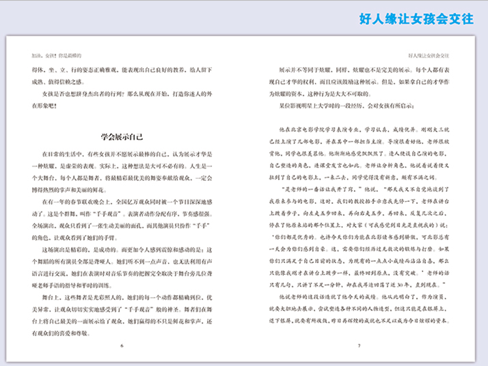 根据女孩的心理特点,从多个方面进行指导,培养女孩的社交能力,让她懂得如何赢得欢迎、如何和他人相.处....