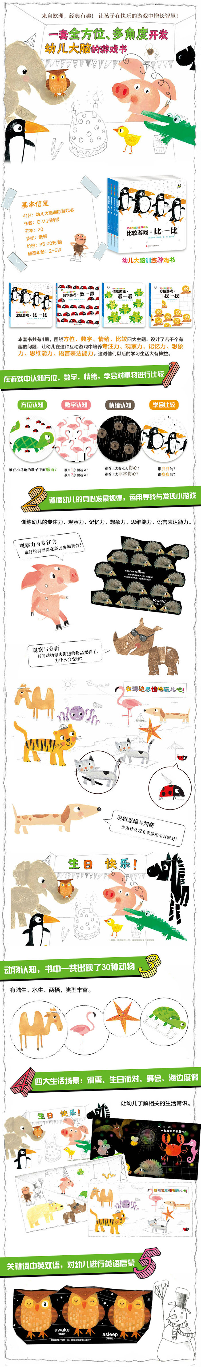 《幼儿大脑训练游戏书》依据先进的大脑科学发展教育理论,从儿童智力发育和认知水平的特点出发,由深谙儿童心理和智力发展特点的比利时的国宝级作家和插画家——G.V.西纳顿精心设计。本套书利用简单的构图巧妙地表达了无穷的奥妙与趣味,力求对幼儿的左右脑进行由易到难、循序渐进的训练和开发,从而让孩子的智力得到科学的开发。