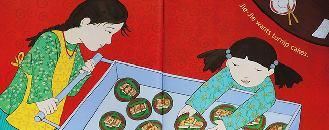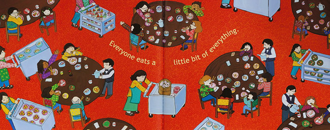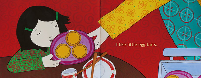 作者Grace Lin用这样家庭活动来介绍饮食生活,生动有特色。从封面的筷子、前蝴蝶页的食材、书名页的天下为公牌楼、爸爸妈妈带着一家人进入雕龙画栋的餐厅,版权页的鱼缸,非常生动,因为中式餐厅门口的鱼缸除了养着活鱼吸引客人,同时有招财的意义,翻到这里才四个开页,她已经用近、广、远、俯的角度呈现,接着看推着推车的侍者,穿着围裙、绑着头发、一车一车的食物,妈妈想要叉烧包、爸爸要炸虾、姊姊要萝卜糕、妹妹要豆花、主角想要蛋塔,每个人每样都吃一点,餐厅里的人也都是这样的,大家什么都吃一点,把每盘都吃光。