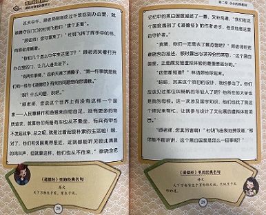国学社成员最近参加了“《道德经》文化大展”,在展览中,他们不仅看到了许多翔实的文字记载和丰富的史料,主办团队还采用最先进的技术,对展览进行了立体而有趣的设计,让参展者身临其境地了解《道德经》这一国学经典书籍。国学社成员还在虚拟场景中参与了圣人评选、黑白战争等活动,收获满满。《藏在故事里的国学》系列是国内首套传统文化知识主题冒险小说,高考语文状元倾情讲述,知名权威老师专业审读。