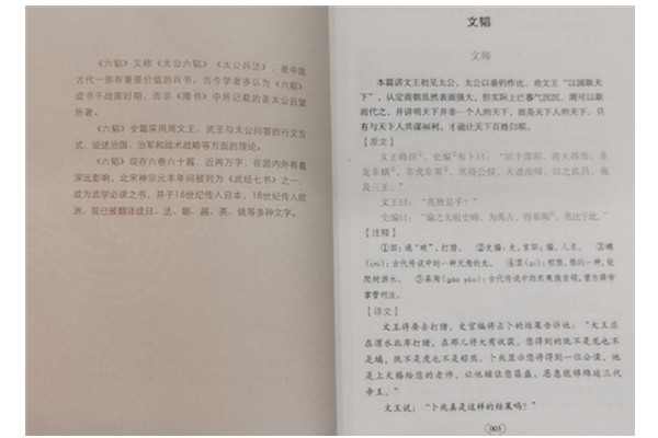 《六韬》又称《太公六韬》《太公兵法》,是中国古代一部有重要价值的兵书,一般认为成书于战国时期。全篇采用周文王、武王与太公问答的行文方式,论述治国、治军和战术战略等方面的理论。《三略》原称《黄石公记》,又叫《黄石公三略》,是中国古代第一部专讲兵法战略,兼顾军事战略的奇书,北宋神宗元丰年间被列《武经七书》之一。传说为西汉初期黄石公传授给张良。