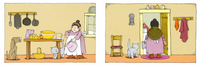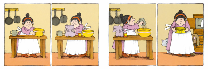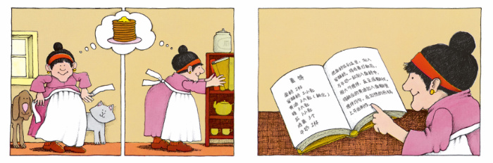 《早餐蛋饼》是凯迪克大奖得主、美国著名图画书作家汤米·狄波拉的首部无字书。故事发生在一个白雪皑皑的清晨,一位小老太太起床后想吃蛋饼,她会如何实现愿望呢?她按照食谱一一准备食材,并穿戴整齐到商店去买枫糖浆,回来的路上畅想着摊蛋饼的情景。出乎意料的是,推开家门的一瞬间,猫在喝牛奶,狗在吃鸡蛋,香喷喷的蛋饼美梦化为泡影。就在这时,她闻到了空气中飘来的香味儿……故事启发我们做事情要有锲而不舍的精神,同时也给了我们一种家常式的安慰:事情总不会太糟,即使前面出了乱子,后面说不定会有惊喜。这是一种十分爽朗的生活态度。