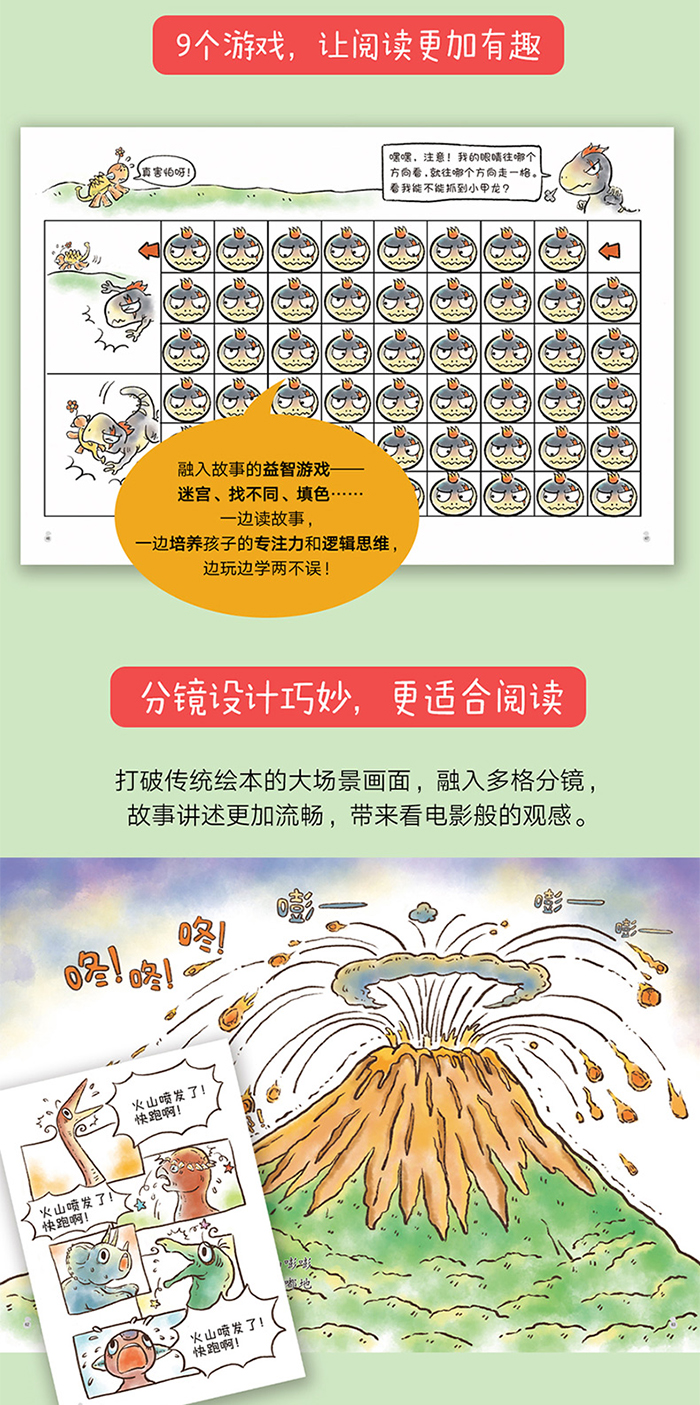 《小翼龙大冒险》是献给孩子的成长童话,它是充满想象力的恐龙冒险故事,也是一曲大自然的生命赞歌。第一辑共四册,由知名动物小说作家袁博创作,围绕着核心人物小翼龙展开系列故事。主线为小翼龙寻找妈妈,介绍了小翼龙在恐龙世界中的探险故事。故事用卡通感强的形象和水彩的着墨风格呈现,既有趣味性也有艺术性。 第一册《智斗霸王龙》 小翼龙和妈妈住在海边的悬崖上,妈妈外出捕鱼后,小翼龙贪玩飞到了恐龙森林中,并在那里遇到了四只小霸王龙…… 第二册《寻找三角龙妈妈》 小翼龙迷路,找不到妈妈了。突然“从天而降”一颗恐龙蛋,一只恐龙宝宝爬了出来,谁才是他的妈妈? 第三册《勇救小甲龙》 讨厌的霸王龙兄弟又来了!“不可以吃掉我的朋友”一场惊险的狩猎游戏…… 第四册《鸭嘴龙听错了》 轰隆隆—— 什么声音?糟了,是比霸王龙还可怕的“神秘生物”?!