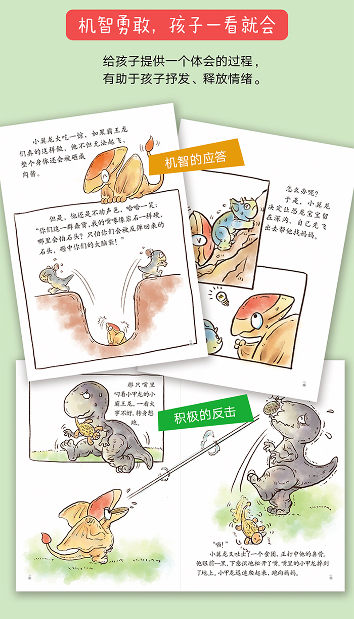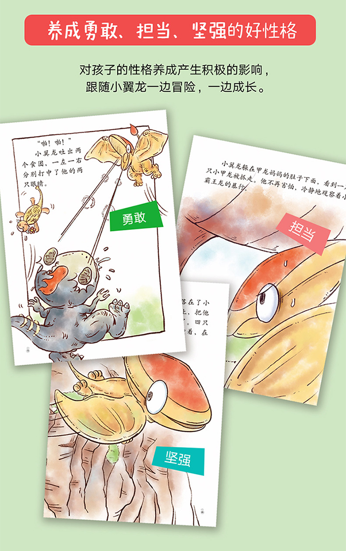 《小翼龙大冒险》是献给孩子的成长童话,它是充满想象力的恐龙冒险故事,也是一曲大自然的生命赞歌。第一辑共四册,由知名动物小说作家袁博创作,围绕着核心人物小翼龙展开系列故事。主线为小翼龙寻找妈妈,介绍了小翼龙在恐龙世界中的探险故事。故事用卡通感强的形象和水彩的着墨风格呈现,既有趣味性也有艺术性。 第一册《智斗霸王龙》 小翼龙和妈妈住在海边的悬崖上,妈妈外出捕鱼后,小翼龙贪玩飞到了恐龙森林中,并在那里遇到了四只小霸王龙…… 第二册《寻找三角龙妈妈》 小翼龙迷路,找不到妈妈了。突然“从天而降”一颗恐龙蛋,一只恐龙宝宝爬了出来,谁才是他的妈妈? 第三册《勇救小甲龙》 讨厌的霸王龙兄弟又来了!“不可以吃掉我的朋友”一场惊险的狩猎游戏…… 第四册《鸭嘴龙听错了》 轰隆隆—— 什么声音?糟了,是比霸王龙还可怕的“神秘生物”?!