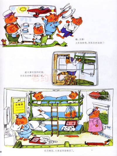 我先买了斯凯瑞金色童书的第二辑全套两本,不管是封面还是里面的插图都特别鲜艳漂亮。一本有情节,七岁的儿子认真地翻阅着,“呵呵”地合不拢嘴。一本没有情节,只是单词,虽然许多单词大人都不认识,但一样地讨儿子喜欢。为此,又买了第一辑。和前面买的风格一样,至少有一本都是单词。通过孩子那喜不自胜的表情就知道,百分之二百的喜欢。只要能给他带来欢乐的,不用问就是好书。我自己还没有时间静下心来和他一道分享全部的快感,但也知道了小屁孩儿一家的出行,爸爸的尾巴被鱼咬住了,?是尾巴钓上了鱼;另有一个不小心冲到水里,于是用背背上了鱼;还有一个,头上长出了鱼。真够逗的!
