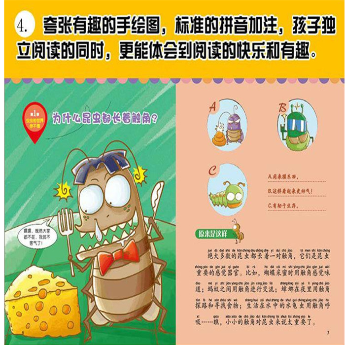 《超有趣 幼儿十万个为什么(礼品装 套装共8册)》内容涉及了动物、昆虫、海洋、大自然、身体、小科学等。是专为小学低年级孩子量身打造的“十万个为什么”。从形式上,选用了孩子感兴趣的幽默搞笑的风格;从内容上,精选孩子们关心和常常问到的问题,用通俗易懂的语言给予解答;在版式上,用色调明快、简洁大气的版面为小读者呈现每一个“为什么”,更便于阅读和理解;在知识的呈现方式上,我们充分考虑到学龄前孩子注意力容易分散的这一点,因此每个页面只展示一个问答题目,这样每一页都有新的内容出现,能很好的抓住孩子的眼球。图文并茂,全文加注汉语拼音,这些也都为孩子的阅读提供了良好的平台。