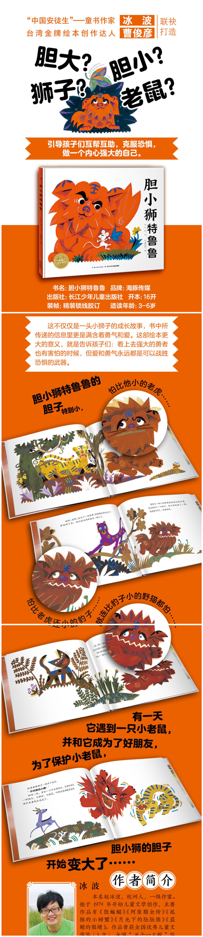 《胆小狮特鲁鲁》是一本针对3-6岁孩子的绘本。一本让孩子学会勇敢、正确面对自己的绘本。充满想象力、夸张诙谐的情节和一波三折的结构引人入胜。特鲁鲁狮子长得高大、强壮,看起来很威武。可是,谁也不知道,特鲁鲁狮子有一个怪毛病,那就是,它的胆子非常非常小。头上落下一片树叶,特鲁鲁狮子也会抱着脑袋,吓得发抖。有一次,它遇见一只老虎。老虎朝它看了一眼,它吓得拼命逃。逃啊,逃啊,特鲁鲁狮子的身体越变越小,变得像豹子一样大了。接着,它又遇到了一只豹子,豹子看了它一眼,它又吓得转身就逃。逃啊,逃啊,它又变小了,变得像野猫一样大了。最后,像老鼠一样小的特鲁鲁狮子遇见了一只小白鼠,它们互相看了一眼,都吓坏了。糊里糊涂的,它们两个都朝一个方向跑。最后才发现,原来对方其实一点也不可怕。
