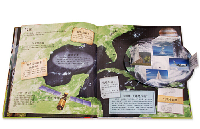透过有趣的文字与震撼的构图,撞击小读者的想象力,启发他们对这个奇妙世界的好奇心。书中除了静态文字和图片外,还有立体折页,可转动的风级转盘,能打开的安全旅行箱,可喷出的老忠实喷泉,还有许多放在信封里的小卡片……所有的信息不再只是一行行的枯燥文字,而是藏在任何一个出人意料的角落,让小读者体验不同一般的阅读快感。